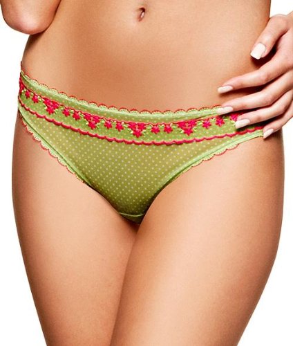 Freya Style 4172. Minimal coverage thong. Sheer, stretch nylon. Chic polka dot pattern. Floral embroidery along front waist. Delicate scalloped trim. Keyhole with bow detail on back. Elastic waistband. Cotton panel. Low, 4.5 inch rise.