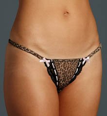 This animal print thong panty is so stylish and trendy, the Elisa panty will be the hippest underwear you could ever have. Low-rise styling is perfect for you low rise pants. Ruched elastic string sides for a flirty look. Adorable lace accents the front panel with a contrasting woven in pink ribbon and bow accents. Add a little spice to your lingerie. Please note this is a FINAL SALE item - sorry, no returns, exchanges or refunds.