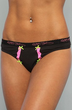 Betsey Johnson The Cotton Logo Thong in Black Raven,Intimates for Women: Model is wearing a size Small Cotton thong with front and allover elasticized trim; lace and ribbon bow accents; 95% cotton 5% spandex. By Betsey Johnson