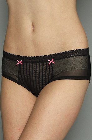 Betsey Johnson The Stocking Stripe Lo Rise Boyleg Panty,Intimates for Women: Model is wearing a size Small Sheer mesh lo rise boyleg panty; with striped lace panel at front; and contrasting ribbon bow details; 100% polyester. By Betsey Johnson