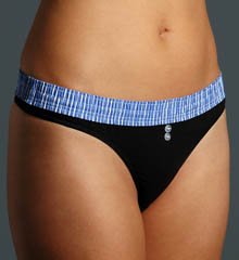 Foxers Black B-String with Foxer Blue Stripes. Wide elastic woven blue and white striped waistband with black bow at center back, so you don't mind if they peek out of the top of your jeans. This black stretch cotton thong panty features two white buttons center front. Black elastic trim accents the legs. Let the world think you are wearing men's boxers... only you will know it is a stretch, cotton thong undergarment. Make it a set with the matching Black Cotton Bra with Foxer Blue White Stripes . Please note this is a FINAL SALE item - sorry, no returns, exchanges or refunds.