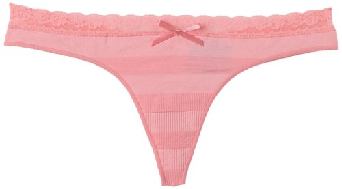 Maidenform Style 40131. Seamless thong. Stretch nylon. Contrasting stripes. Lace waistband with satin bow. Tagless for comfort. Daringly low, 4 inch rise.