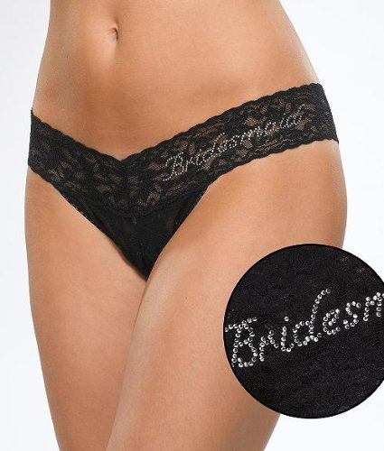 Hanky Panky Style 491031. Minimal coverage thong. Ultra-sheer, stretch lace. Crystal "Bridesmaid" embellishment. Flat curved waistband. Cotton panel. Daringly low, 3.5 inch rise. Makes a perfect Bridal Shower gift.